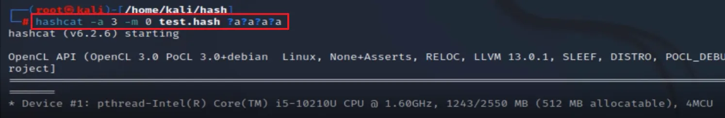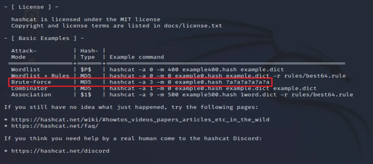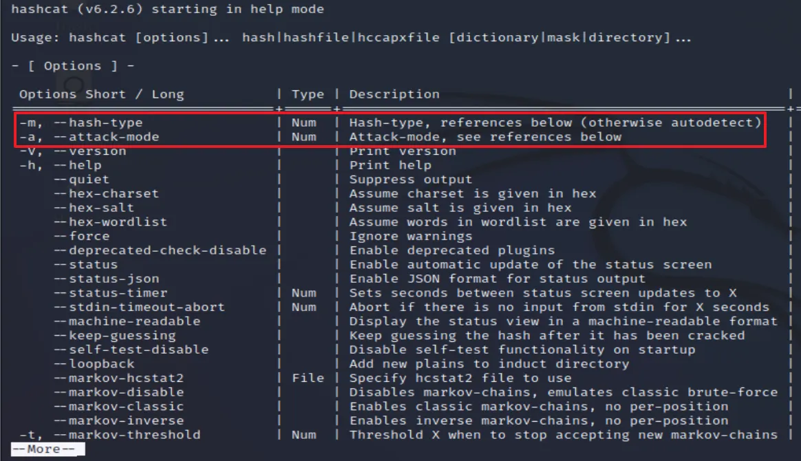 hashcat -a [공격모드] -m [해시 알고리즘] [해시 파일] [예상 Byte]
