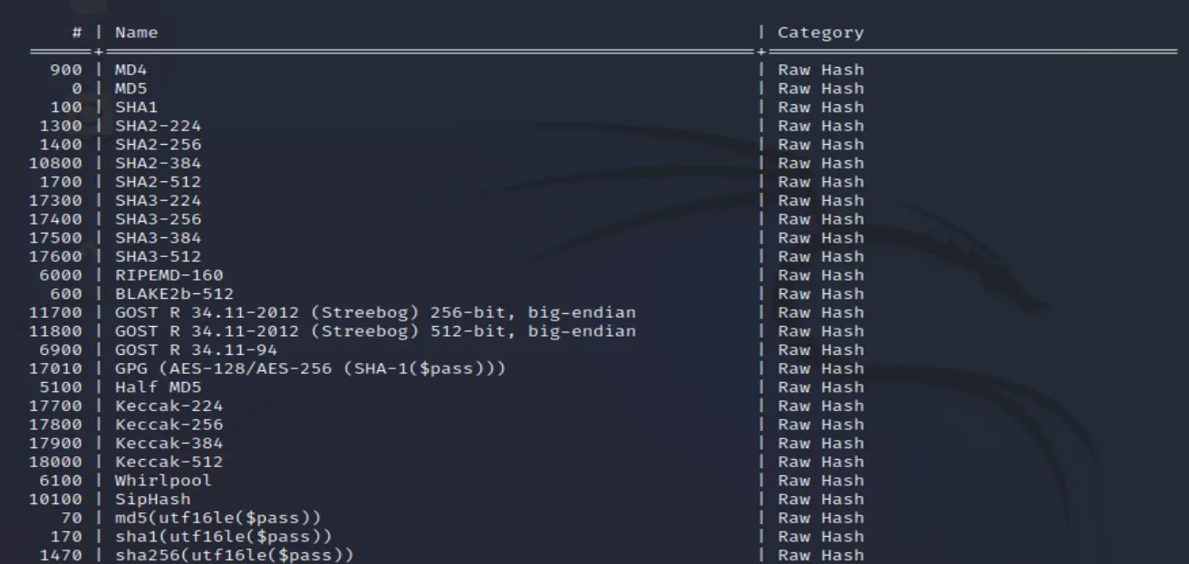 hashcat은 수많은 해시 알고리즘을 지원하며 해당 번호로 지정하여 사용할 수 있다.