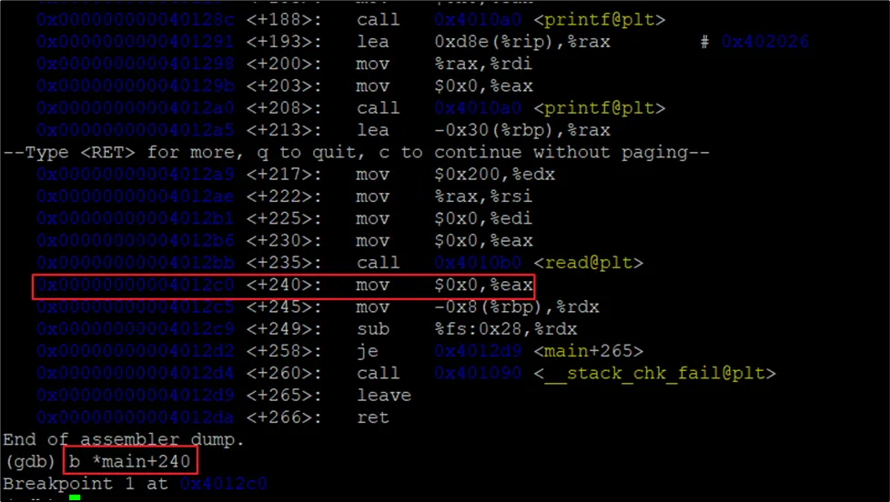 gdb를 이용하여 디버깅 시 read함수가 실행되도록 하위주소인 main+240 주소에 브레이크 포인트를 적용하고 실행한다.