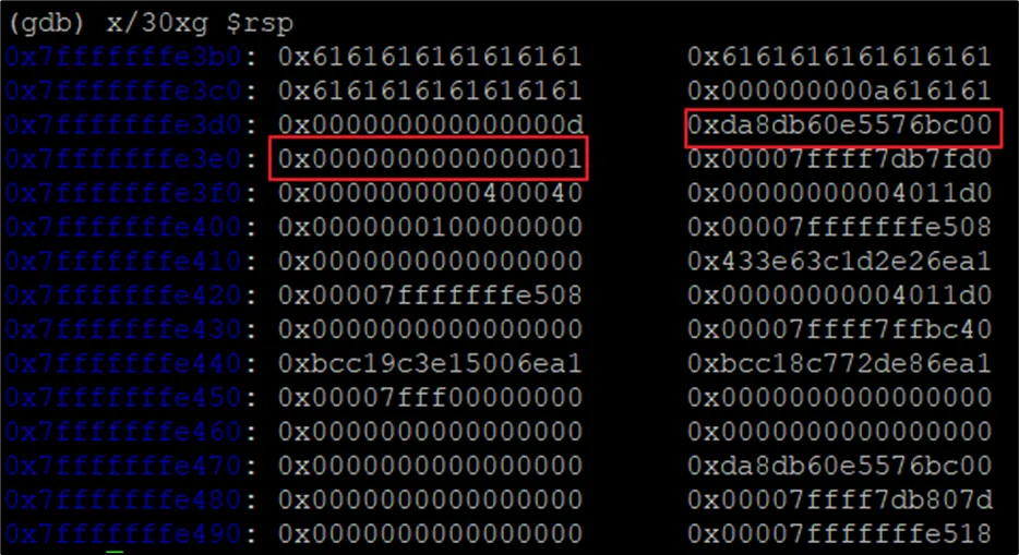 실행 후 rsp값을 확인해 보면 40Byte 만큼 버퍼가 존재하고 다음 Canary가 8Byte만큼 존재하는것을 확인할 수 있다. Canary의 특징은 첫 1Byte가 00(null)값으로 시작하기 때문에 바로 확인이 가능하다. Canary가 00으로 시작하는 이유는 문자열 출력의 끝이 00이기 때문에 출력되지 못하게 00으로 시작한다.