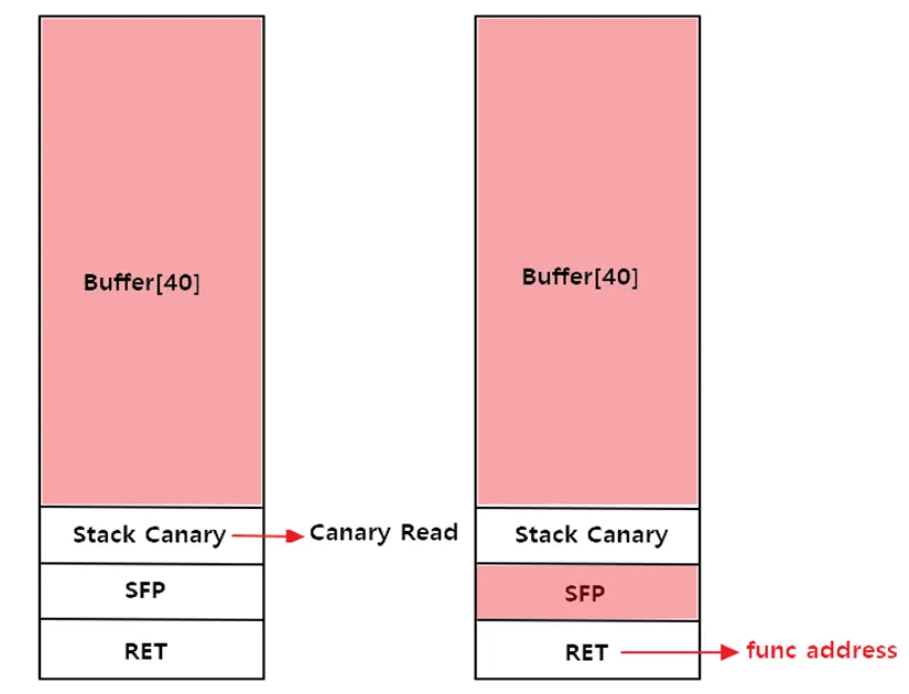 첫번째 read함수 실행 시 Canry의 값을 읽어 들이고 두번째 read함수 실행 시 공격코드를 삽입하여 실행한다. Paylaod = A(40) + Canary(8) + B(8) + func(8)